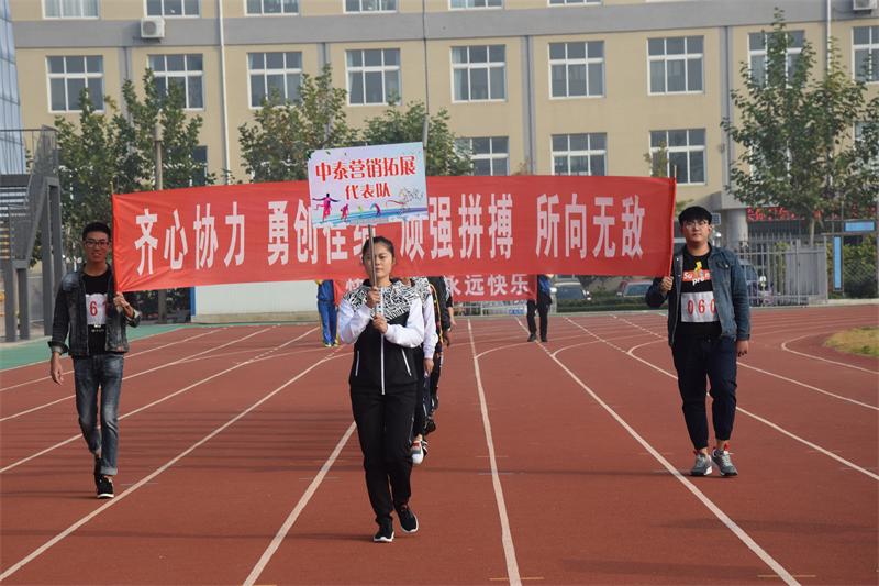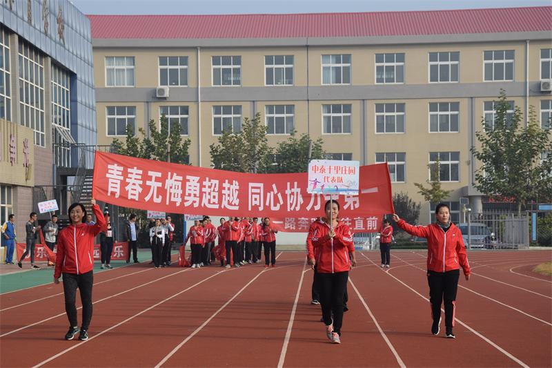 接下来入场的是中泰十里庄园代表队,十里庄园是我们中泰梦腾飞的地方,健康体魄、同心同德是我们中泰人必备的基本条件。十里庄园代表队的口号是青春无悔勇超越 同心协力夺第一。