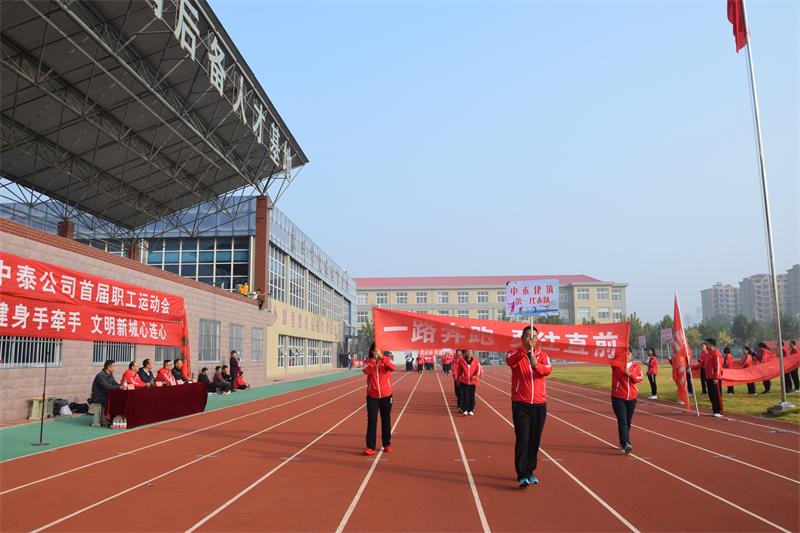 现在入场的是中泰建筑第一代表队,他们的口号是一路奔跑,勇往直前!简洁有力的口号就像他们踏实的工作作风和拼搏的工作精神。